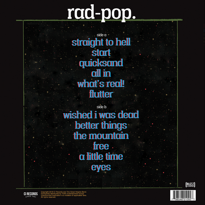 CI099.5: Unlike SIEST, “rad-pop.” is an album about what people have been through rather than who put them through it. Lyrically, it is honest and hopeful, with a hint of reckless abandon. The LP is full of singles and sing-alongs as well as thoughtful and mature compositions that tackle the difficulties of growing up in challenging times. Songs like “Free”, “Flutter”, and “Straight to Hell” offer tongue-in-cheek commentary on the engagement of people with the politics of today, while songs like “A Little Time”, “The Mountain”, and “Start” focus on the value of love and friendship.